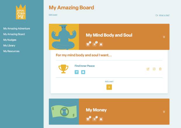 Amazing Me is a rapid prototype proof-of-concept web application focused on giving individuals simple tools for making meaningful, self-directed improvements in their lives based on the roles they play, their personal values, and how they prioritize five key life areas. Users are guided through a video based program explaining the concepts as they explore their roles, values, and priorities and set specific daily, weekly or monthly actions to take in order to make desired improvements in their top priority area. The application keeps users engaged in the process with customizable reminders via email and/or SMS messaging.